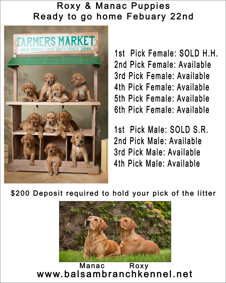 Roxy & Manac fox red labs puppies for sale Previous Next Published February 6, 2020 at 2400 × 3000 in Pictures of our Puppies Like Loading...