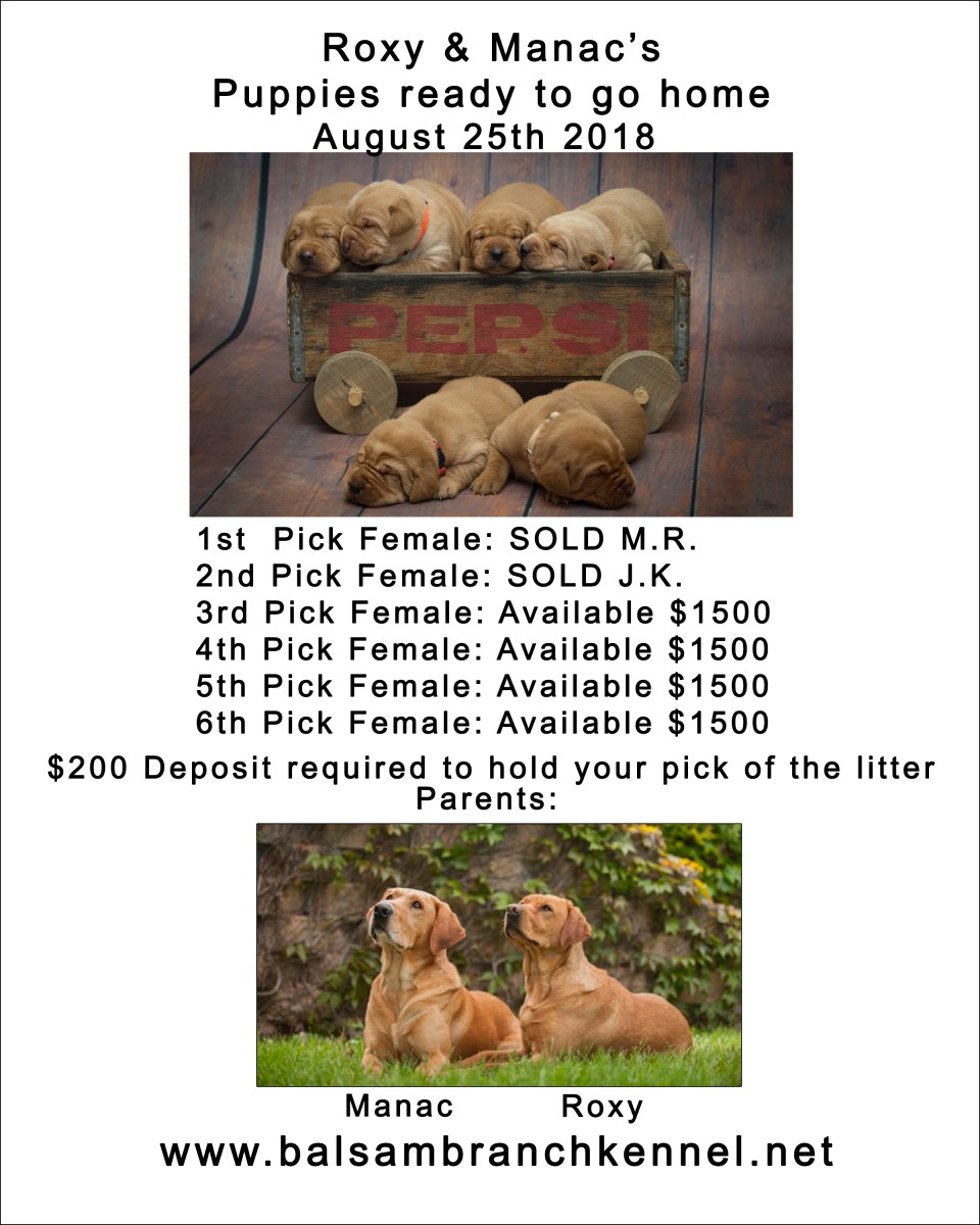 Roxy & Manac fox red labs puppies for sale Previous Next Published July 16, 2018 at 2400 × 3000 in Pictures of our Puppies Like Loading...