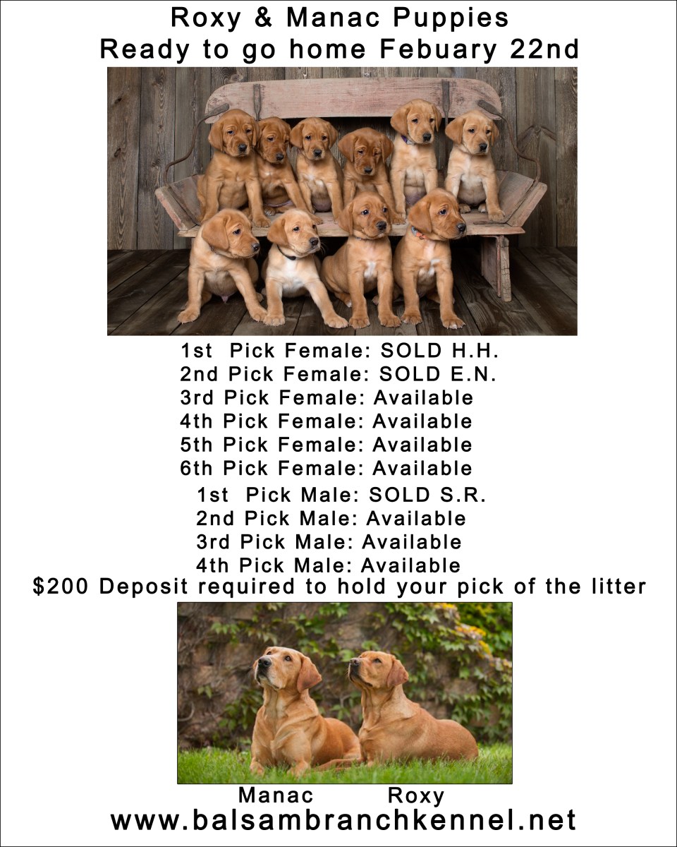 Roxy & Manac fox red labs puppies for sale 6wk Previous Next Published February 11, 2020 at 2400 × 3000 in Pictures of our Puppies Like Loading...
