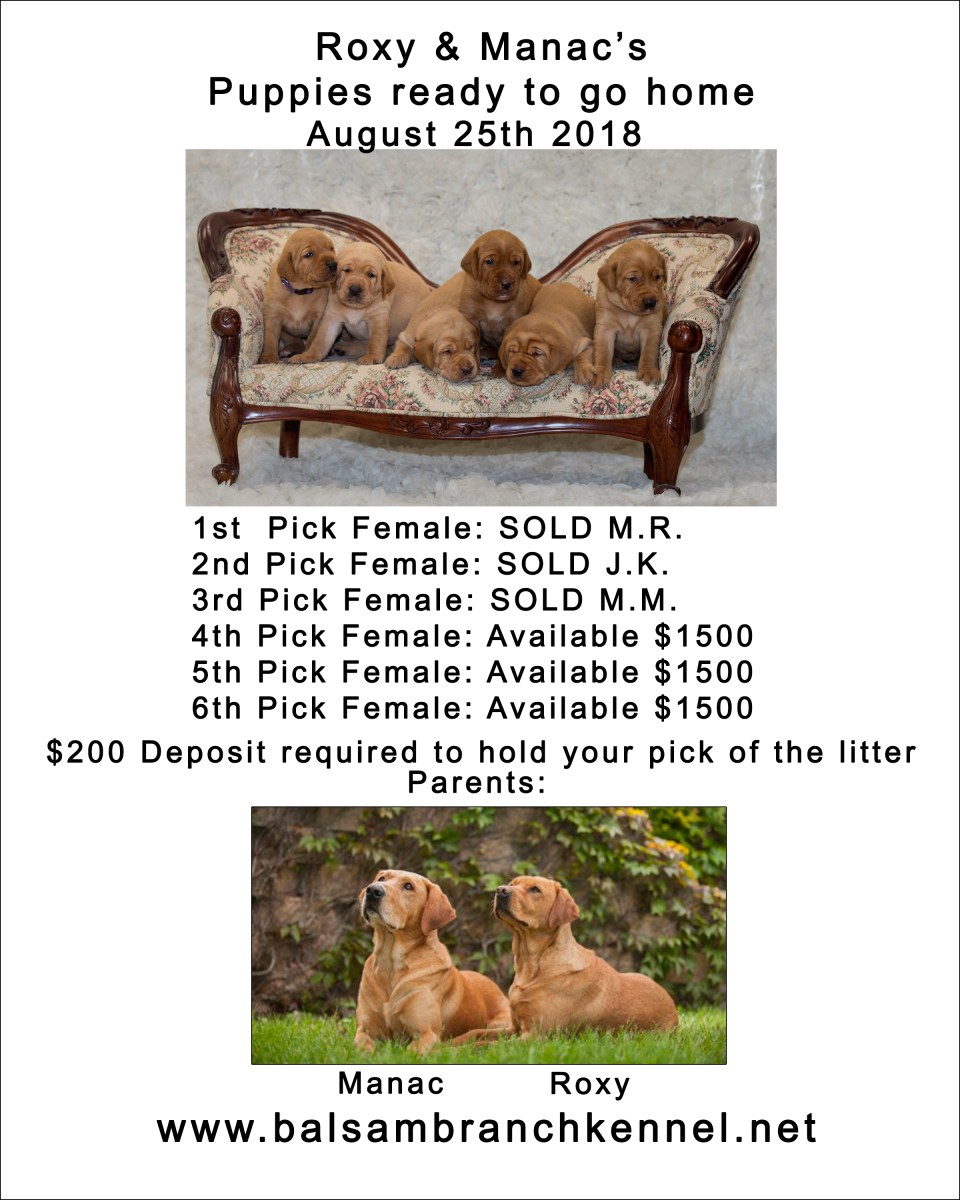 Roxy & Manac fox red labs puppies for sale Previous Next Published August 3, 2018 at 2400 × 3000 in Pictures of our Puppies Like Loading...